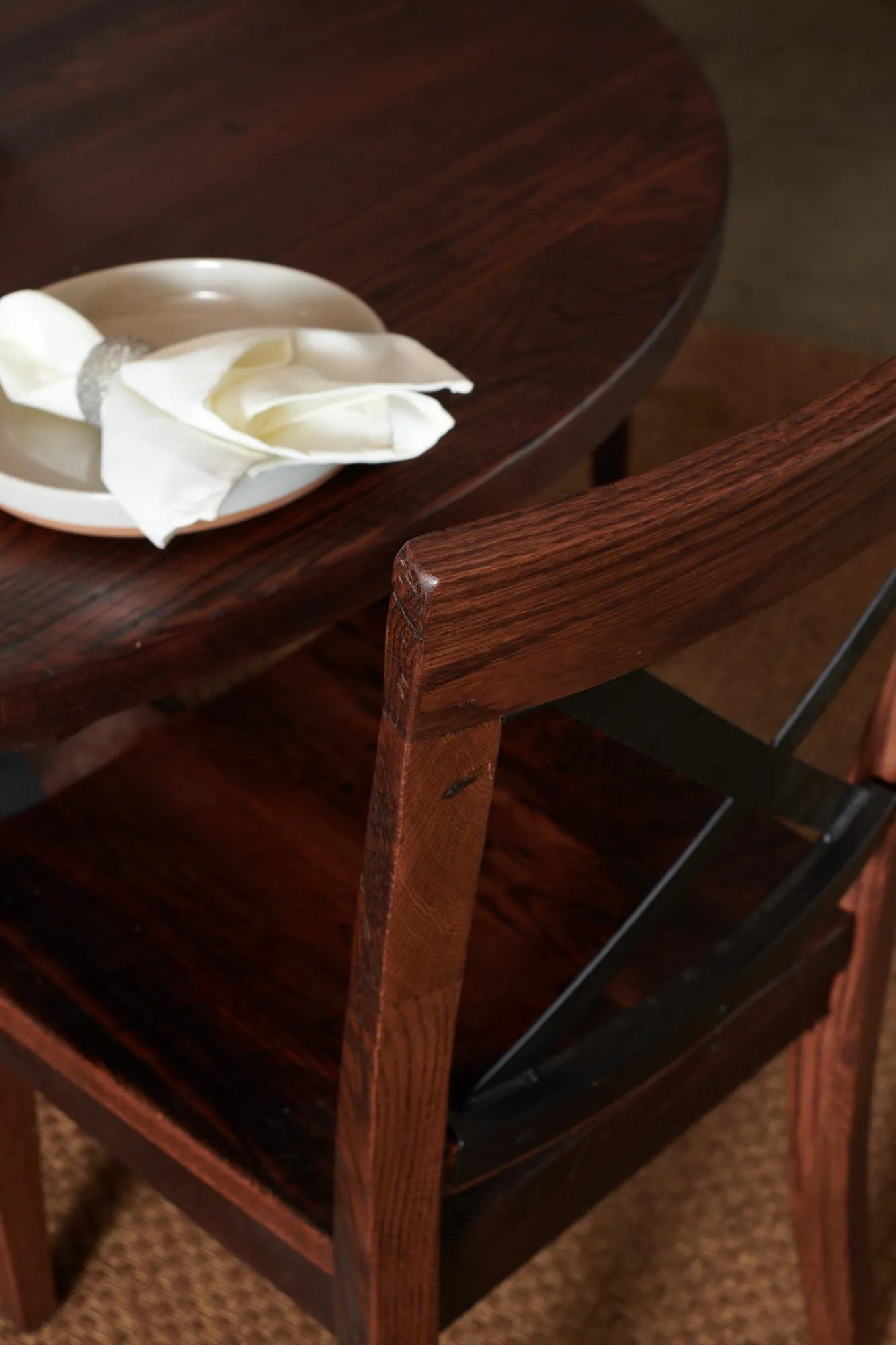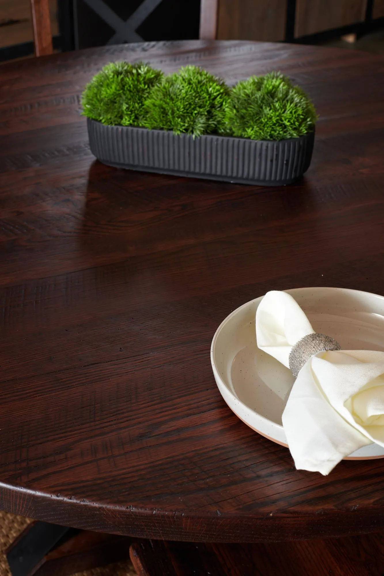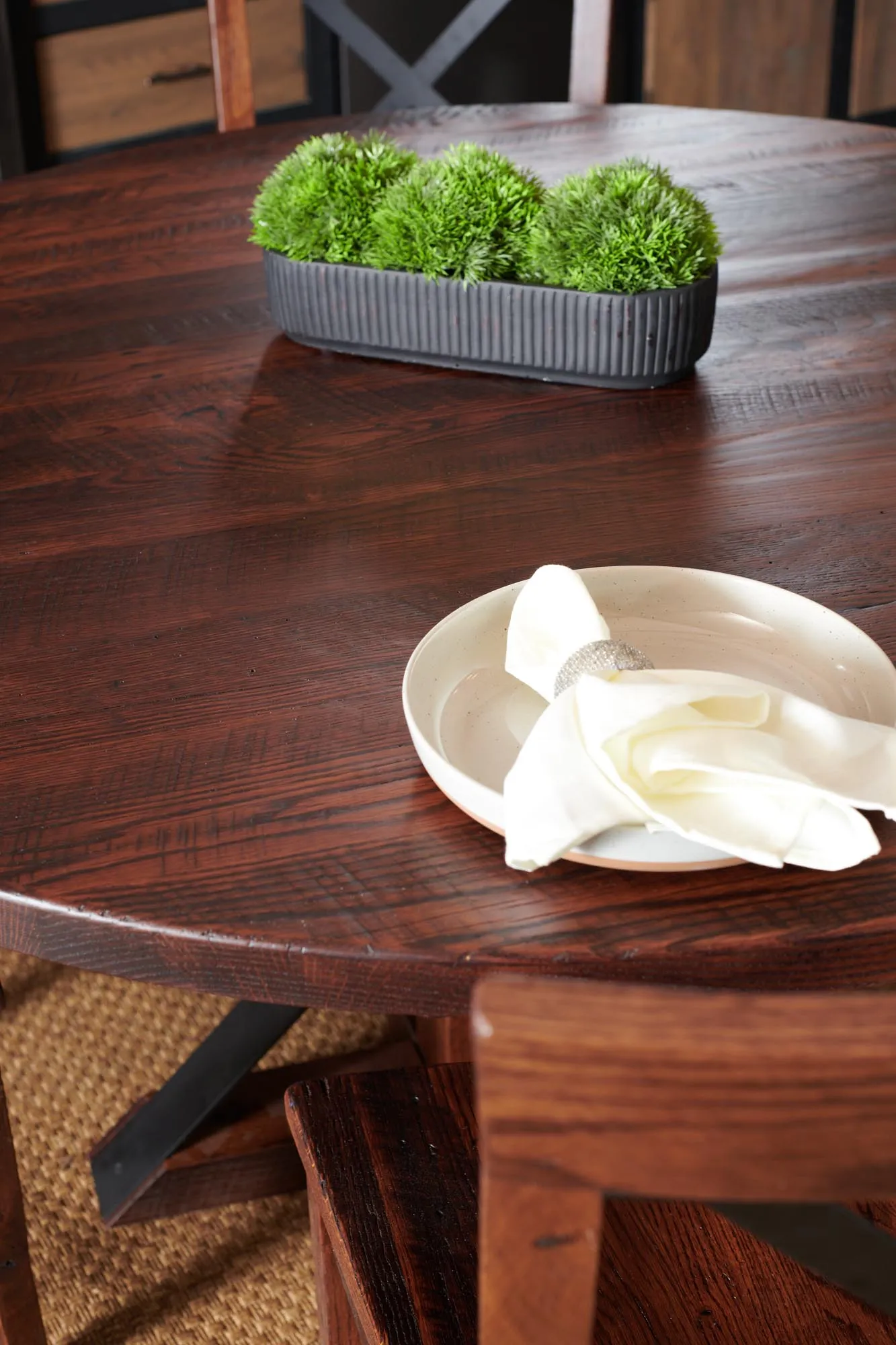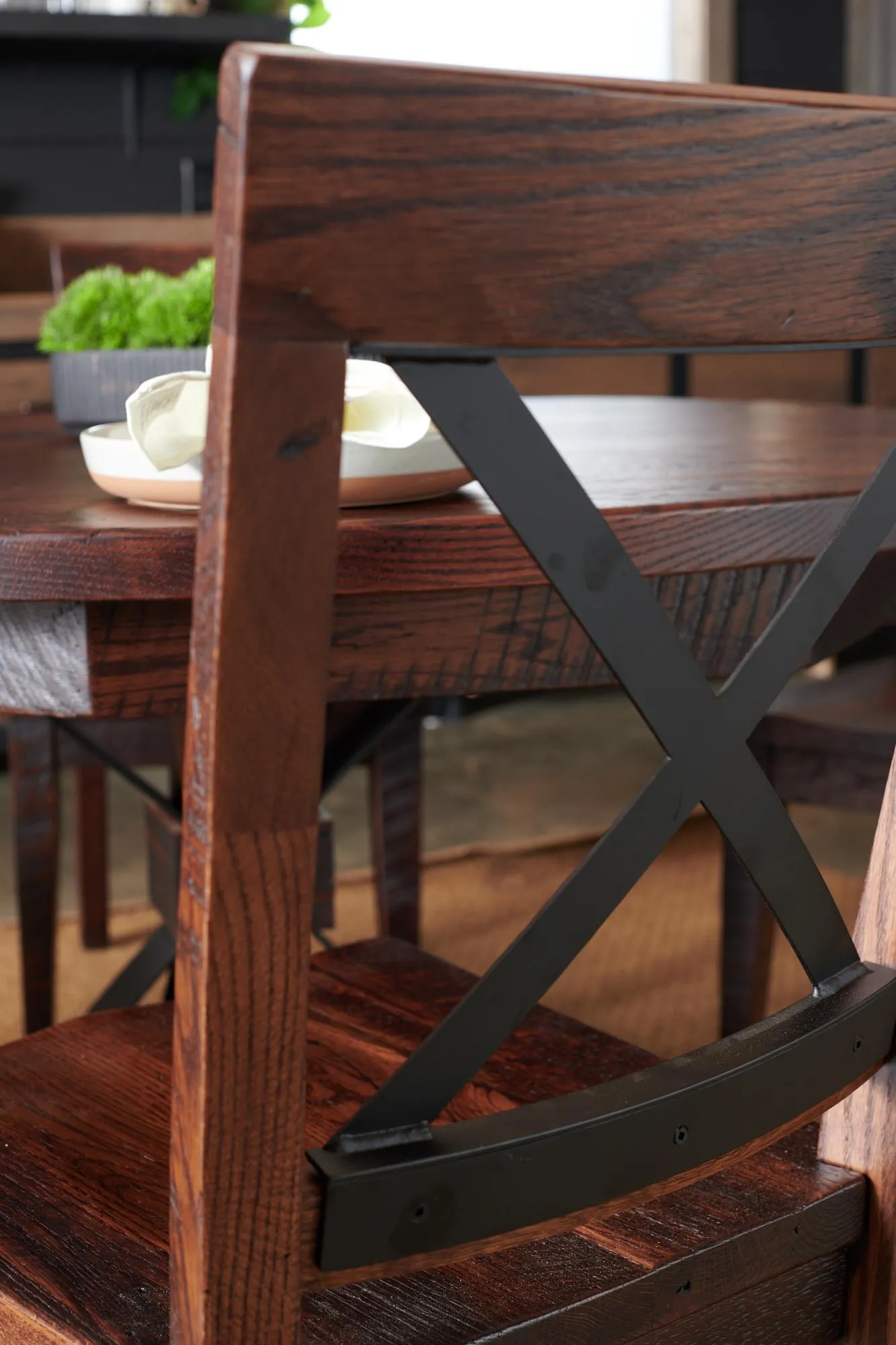 Comfortable chairs catch the eye with metal crossbacks that match the table base design.